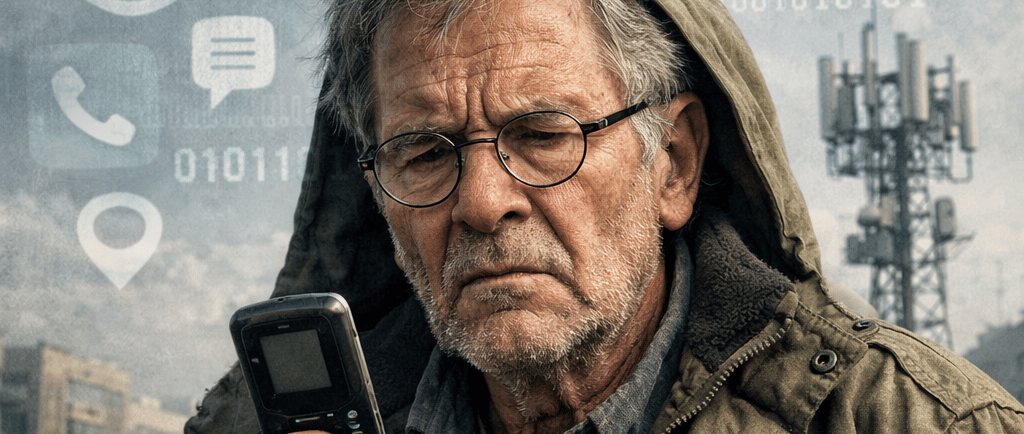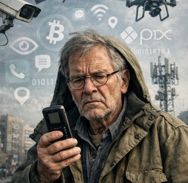 Aderbal ajeita os óculos na ponta do nariz e observa a rua com cautela. Prefere dias nublados — céus claros demais lembram satélites, vigilância e olhos invisíveis. No bolso, carrega um celular antigo, de teclado físico e tela simples. Para ele, quanto menos funções, menos riscos.